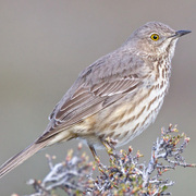 Sage Thrashers are light-colored, streaked thrashers, with long, strong legs, long tails, and pale eyes. They have straight bills, which are shorter than those of other thrashers. Sage Thrashers are slightly smaller than American Robins, with light, gray-brown upperparts with light streaking, and buff-to-white underparts with heavy streaking. They show white corners on their tails in flight.